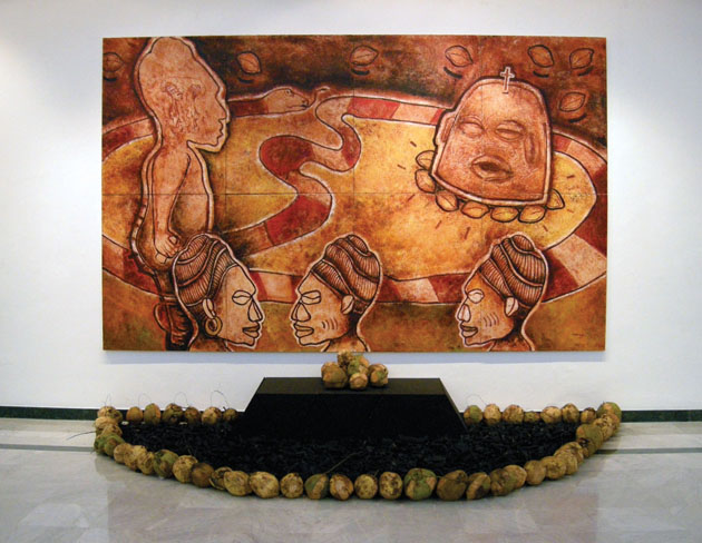 Archeology of Memory: They are Talking, 2010. Installation View. Encaustic painting on linen, sculptures and organic material. Presented at the Palacio de Bellas Artes de Santo Domingo, Dominican Republic.