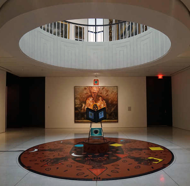 Manifesto of an Arteologist (2016) is the center piece of the installation. It is representative of the tattwa Akash, from which all energy emanates. It includes the skylight of The Museo de Arte de Ponce radiating the vibrant energy of the sun; the circular floor piece below with painted African figures riding bicycles and projecting the geometric elements of the tattwas, cowrie shells suggestive of vibrant forces, and the deep black meditative oval of the element of ether. Within a box designed to look like a book are two tablets connected to the internet. The “book” is placed on a metal pedestal at the center of the floor installation, with a small painting of the oval mounted in the base of the pedestal. The internet pages of this virtual book are themselves a collaborative art/computer science piece co-created with Jorge A. Gautier.
